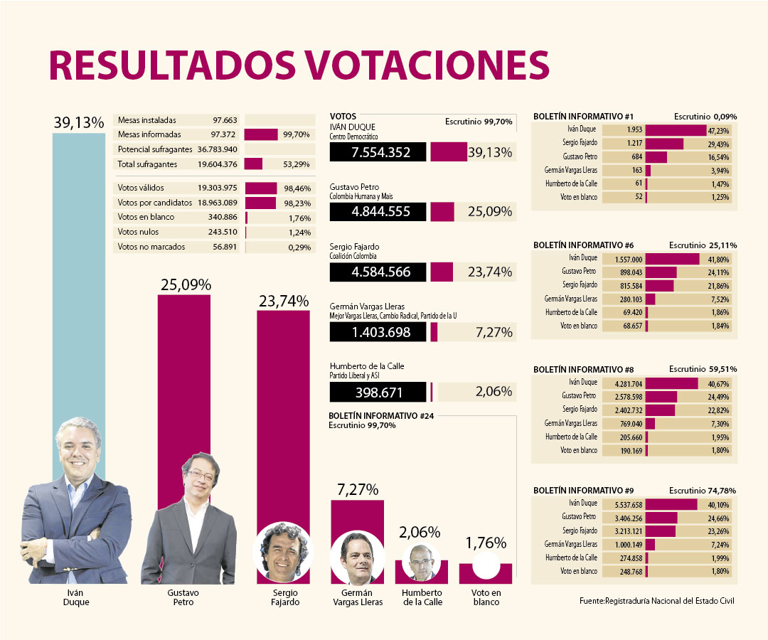 En los últimos 28 años por la Casa de Nariño han pasado dos economistas y tres abogados, quienes llevaron las riendas del país y han conducido a tener la Colombia de hoy. Con el conteo de 99,7% de las mesas, el bogotano Iván Duque con una votación de 7.554.352 votos y el cordobés Gustavo Petro con 4.844.555 de votos pasaron a la segunda vuelta que se realizará el próximo 17 de junio.