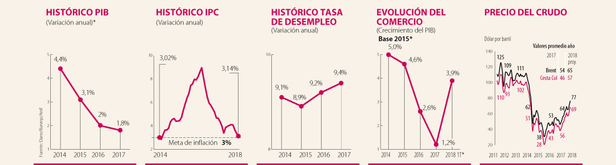 El año pasado, la economía colombiana experimentó uno de sus periodos más difíciles desde hace ocho años: la actividad local creció un agridulce 1,8% arrastrada por las caídas de la explotación de minas (-3,6%), la manufactura (-1,0%), la construcción (-0,7%) y el transporte (-0,1%) en un año marcado por el impacto de la Reforma Tributaria de 2016; el ajuste de la inflación, y la lenta recuperación de los precios del petróleo.