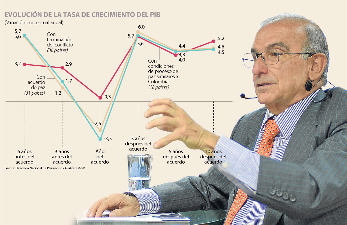 Con estas propuestas, el candidato presidencial prevé que el PIB tenga un crecimiento anual por encima de 5% tres años después de la firma del Acuerdo de Paz; que ese incremento sea de 4,4% a cinco años de la firma del acuerdo, y en 10 años esa subida del PIB llegue a 4,6% con el Acuerdo de Paz, y a 5,2% con condiciones de procesos de paz similares a los de Colombia.