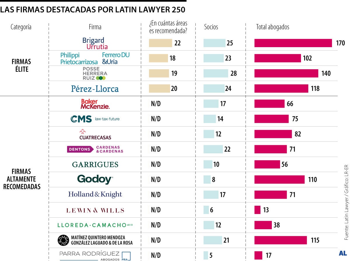 Estas firmas son Brigard Urrutia, recomendada en 22 áreas de práctica y reconocida como líder del mercado élite; Philippi Prietocarrizosa Ferrero Du & Uría, PPU, destacada en 18 ramas del derecho y conocida como un despacho regional pionero con prestigio local; Posse Herrera Ruiz, recomendada en 19 especialidades y conocida como un peso pesado de las transacciones modernas; y Pérez-Llorca, Gómez-Pinzón, en 20 áreas y que sobresale como líder transaccional con perspectiva regional.