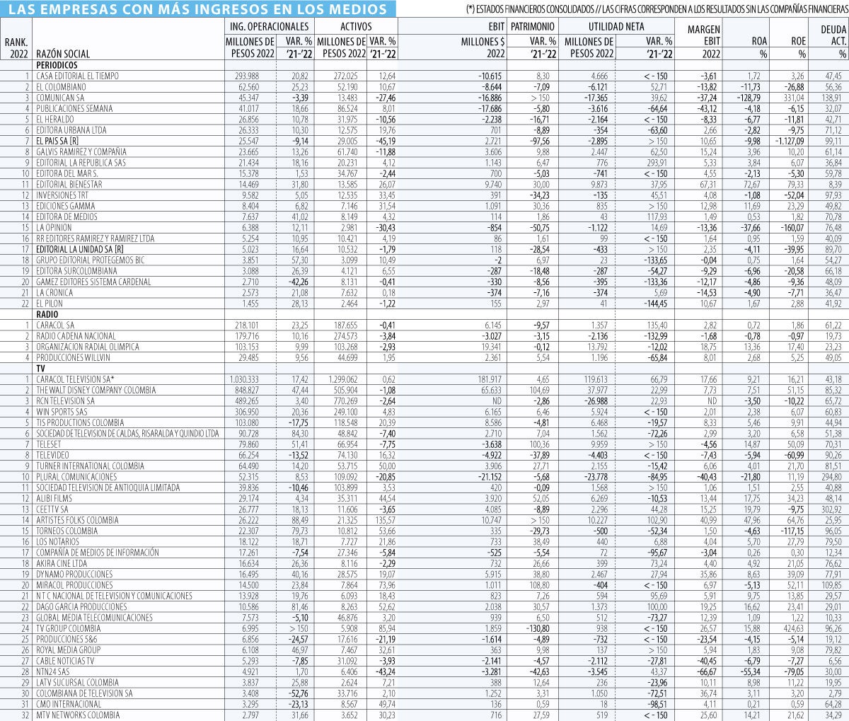 En total, los cinco primeros medios sumaron 64% de los ingresos de la industria reportados ante la Superintendencia de Sociedades, entre los que clasificaron 58 empresas del sector de comunicación que totalizaron $4,61 billones. El top 10 lo completan las cadenas radiales Caracol y RCN , junto con la operación de la Organización Radial Olímpica.