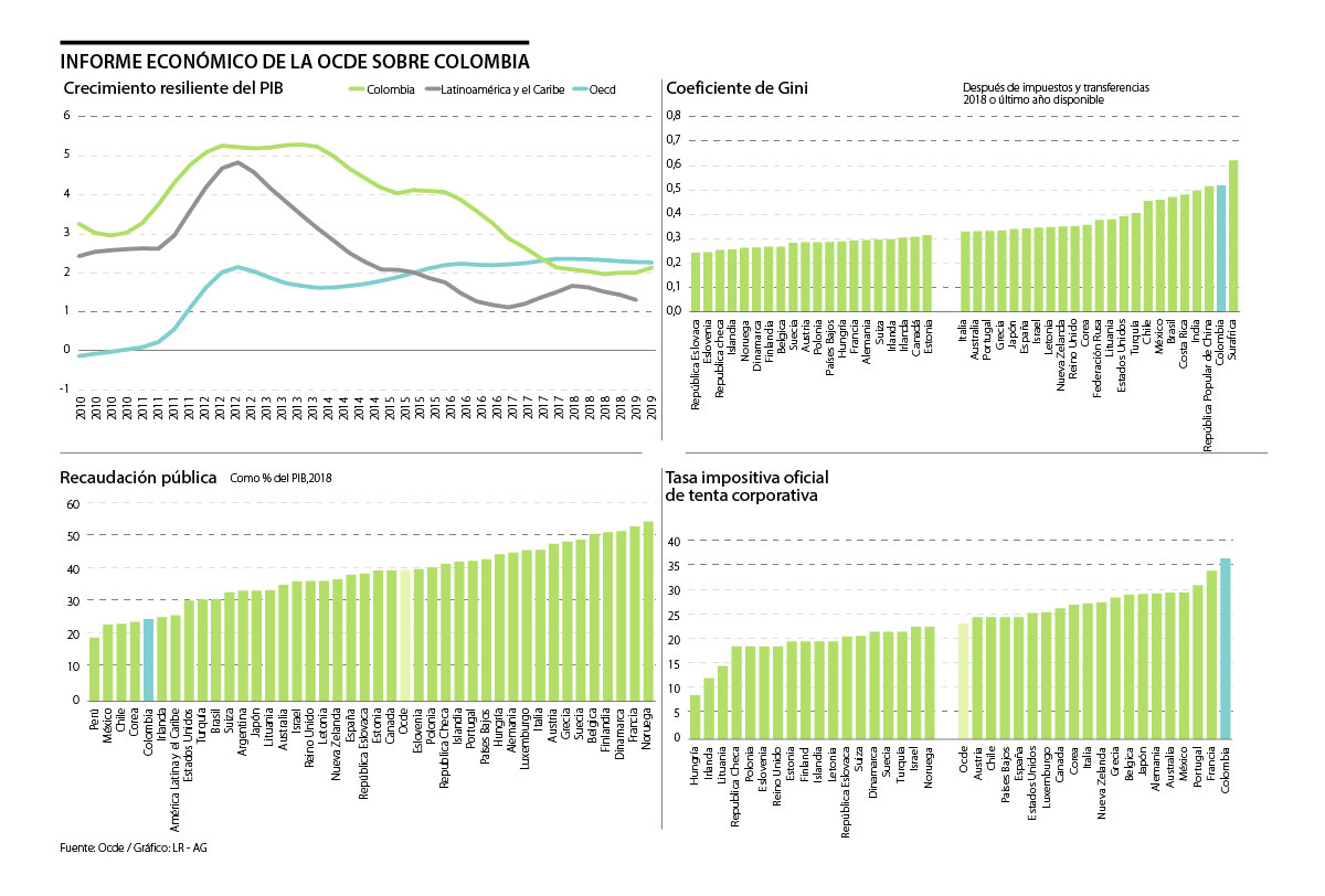 La Ocde hizo una comparación de los ingresos fiscales con relación al PIB, allí en su tabla, el país tiene un nivel menor al 30%, (solo mejor en América Latina que México y Perú), mientras que la recomendación del organismo es que estos deberían estar más cercanos al promedio de los países miembro el cual es de poco más de 40%.