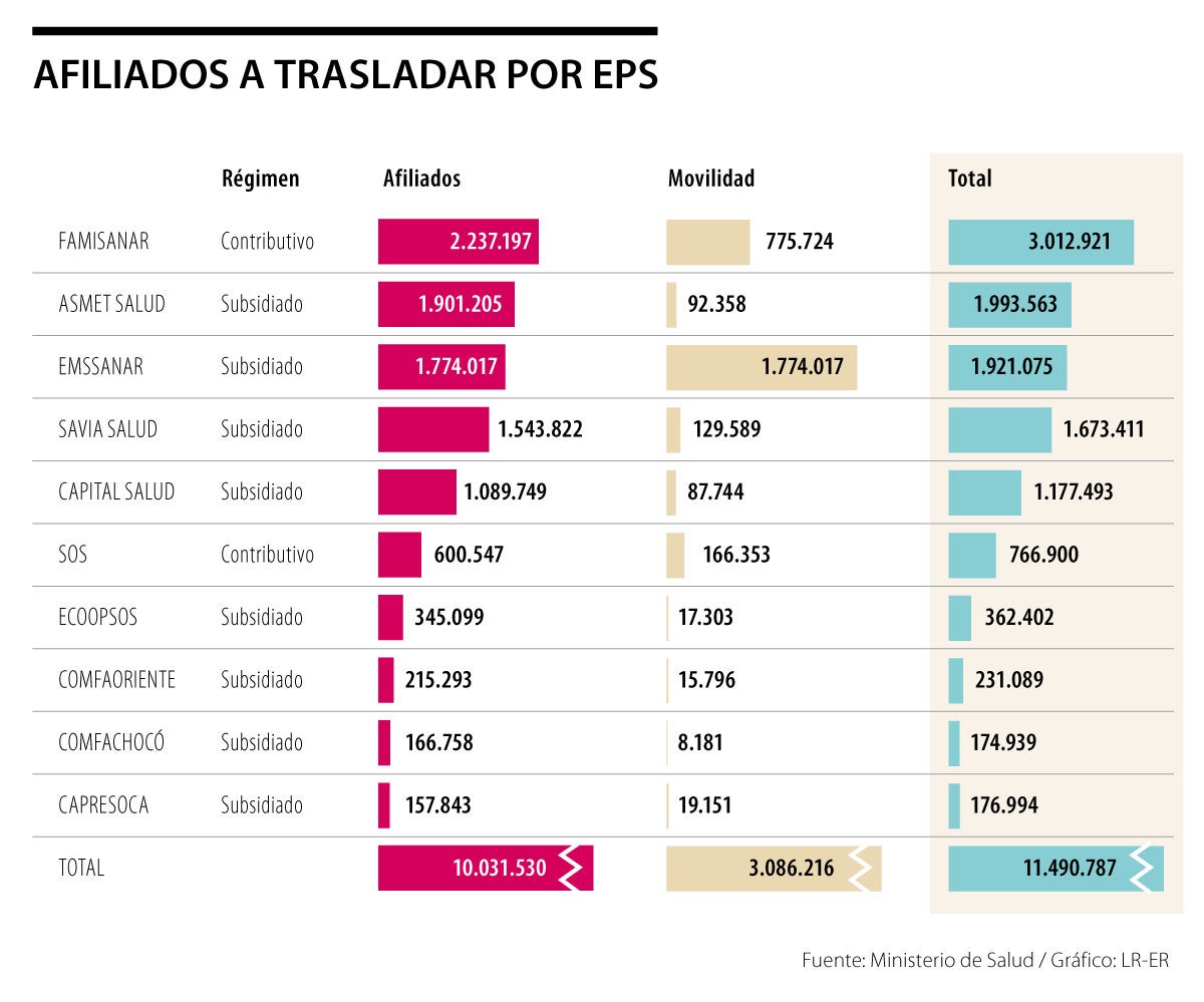las EPS que deberán trasladar sus afiliados son: Famisanar, con 2,2 millones de afiliados, Asmet Salud, con 1,9 millones; entre otras
