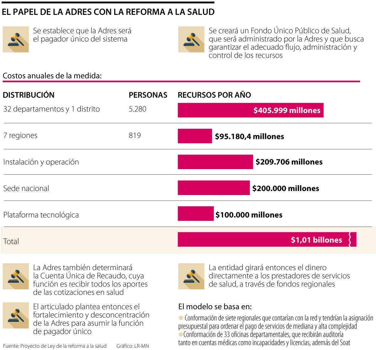 El articulado plantea entonces el fortalecimiento y desconcentración de la Adres para asumir la función de pagador único. Se basa en la conformación de siete regionales que contratarían la red y tendrían la asignación presupuestal para ordenar el pago de servicios de mediana y alta complejidad; y de 33 oficinas departamentales, que recibirían y auditarían tanto cuentas médicas como incapacidades y licencias, además del Soat, que hoy se audita de forma centralizada.