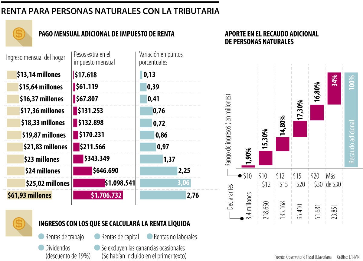 Las personas con ingresos de más de $25 millones verán su impuesto de renta subir en hasta $1,09 millones al mes, poco más de $13 millones en el año, lo que representa un aumento de 3,06 puntos porcentuales.