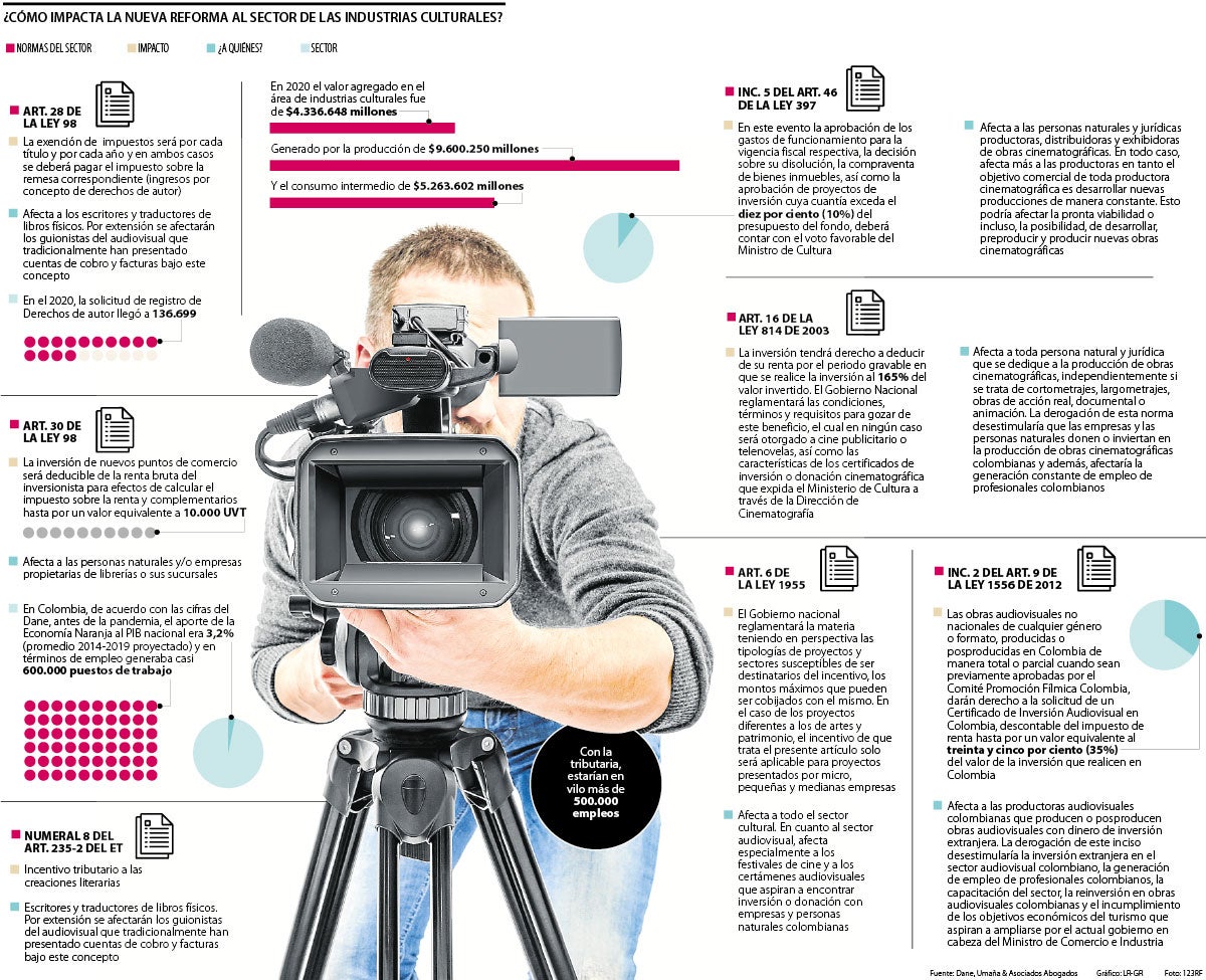 Omar Javier Umaña, Director legal de Umaña & Abogados, asegura que con la reforma tributaria se van a derogar dos beneficios tributarios que afectan al cine y al audiovisual en Colombia. En el artículo 69 se propone suprimir: el inciso 5 del artículo 46 de la Ley 397 de 1997, artículo 16 de la Ley 814 de 2003 e inciso segundo del artículo 9 de la Ley 1556 de 2012.