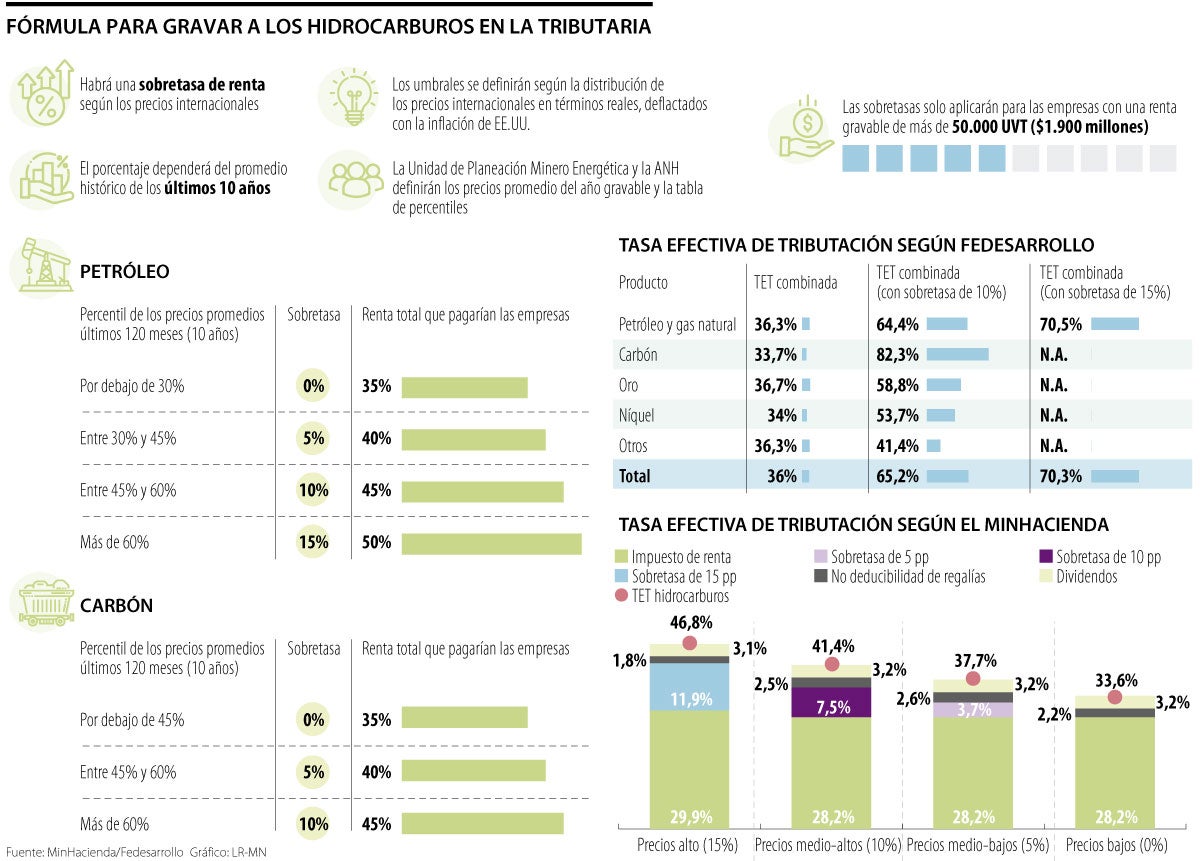 El articulado aprobado en el Congreso define la fórmula que se aplicará para las sobretasas de renta que se ajustaron únicamente para la extracción de petróleo y que dependerán de los precios internacionales. Estas sobretasas serán de 5% o 10% para la extracción de carbón y de 5%, 10% o 15% para el petróleo.