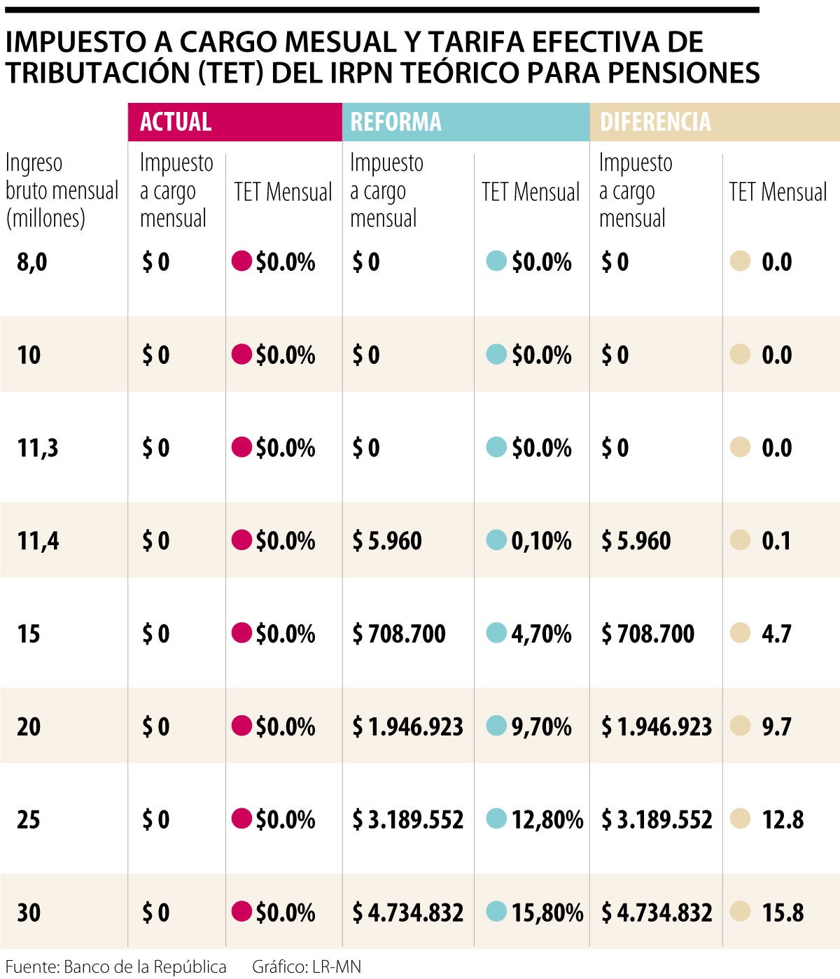 Pero Rodríguez asegura que se debe tener en cuenta que la tabla para personas naturales a la cual se debe sujetar este ingreso empieza en 1.090 UVT, esto es, algo más de $41,4 millones, por lo que en realidad las pensiones que se afectan son las que superan los $125 millones, disminuyendo los aportes a salud. Si se reciben 13 mesadas, estaría gravando pensiones por encima de $9,6 millones.