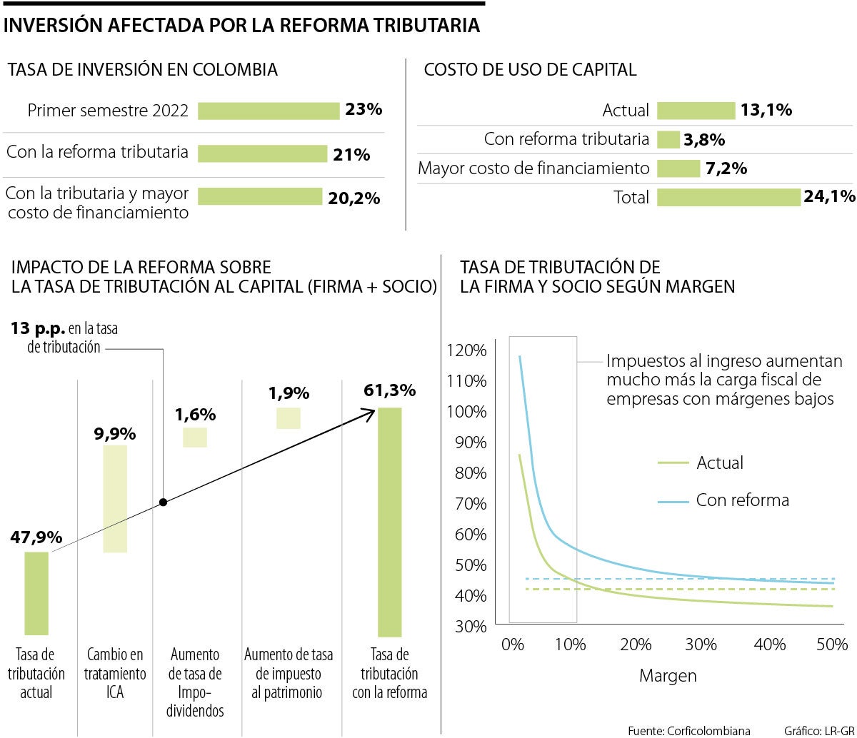 El informe de Corficolombiana también señala que la reforma tributaria que busca recaudar $21,5 billones el próximo año reduciría en dos puntos porcentuales la tasa de inversión de Colombia en el largo plazo, la cual bajará de la tasa actual de 23% a 21%.