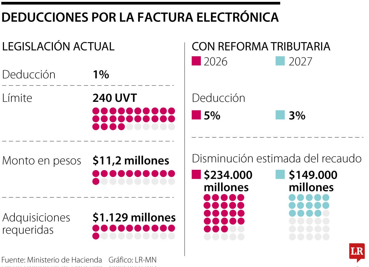 De aprobarse esta regulación y al tomar como ejemplo la UVT de este año, las compras necesarias con factura electrónica en 2026 caerían a $225 millones para poder deducir los mismos $11,2 millones del límite.