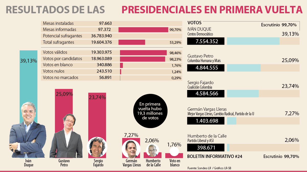 Con el conteo de 99,7% de las mesas, el bogotano Iván Duque con una votación de 7.554.352 votos y el cordobés Gustavo Petro con 4.844.555 de votos pasaron a la segunda vuelta el 17 de junio.