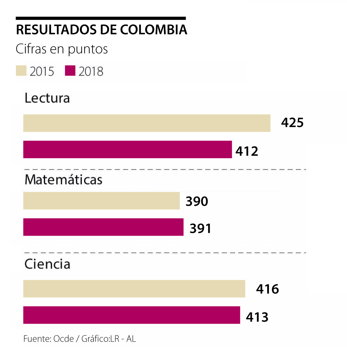 Las pruebas Pisa, que miden el nivel educativo de los estudiantes de 15 años en 79 países del mundo, revelaron que Colombia continúa estando por debajo del promedio de los miembros de la Ocde. Según el informe, si bien Colombia registró una leve mejoría en matemáticas, los componentes de lectura y ciencias cayeron en esta oportunidad, Esto, al comparar las evaluaciones locales con el estudio publicado en 2015 por la misma Ocde.