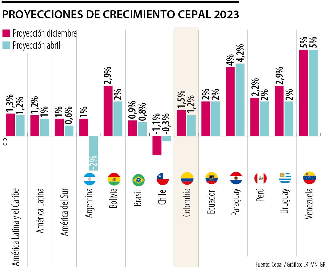 La Comisión Económica para América Latina y el Caribe (Cepal) actualizó sus proyecciones de crecimiento para 2023 en las que evidenció una leve caída de la expectativa para América Latina y el Caribe de 1,3%, que había anunciado en diciembre de 2022. En el caso de América del Sur la baja fue de 0,4 puntos porcentuales (pps) de 1% a 0,6%. De 10 naciones, seis sufrieron disminuciones en la proyección de crecimiento, y las de mayor ajuste fueron Argentina, Uruguay y Bolivia.