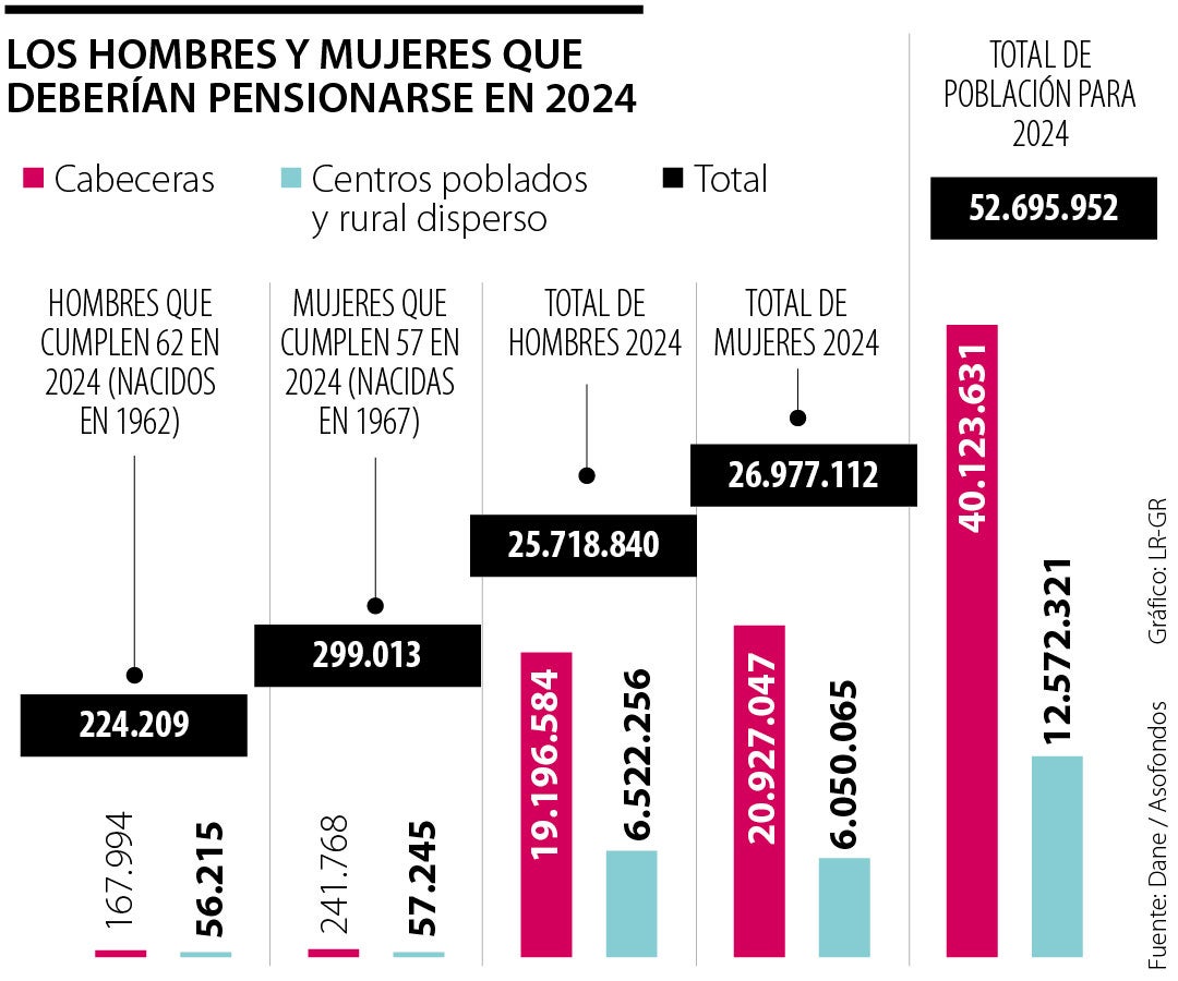 Los sistemas de pensiones en el mundo y en América Latina están a prueba por retos de sostenibilidad, y Colombia no es la excepción. Parte de la intención de la reforma laboral que lanzó el Gobierno Nacional viene motivada por estos factores de la sostenibilidad para el sistema. Para 2024, un total de 523.222 personas cumplirá la edad de pensión, según datos extraídos del Departamento Administrativo Nacional de Estadística, Dane. Se trata de un total de 299.013 mujeres nacidas en 1967 y que cumplen 57 años, y de 224.209 hombres que nacieron en 1962 y cumplirán 62 años.