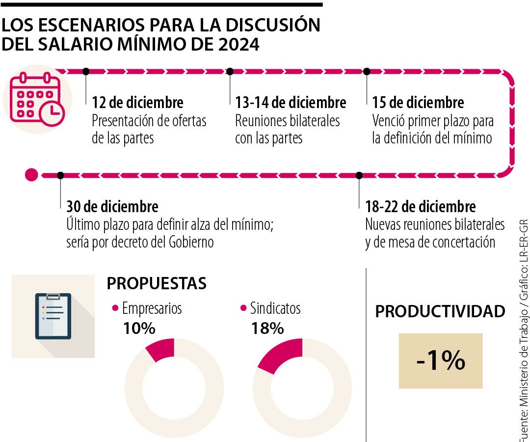 La mesa de concertación para el salario mínimo, que involucra a privados, sindicatos y GobiernoNacional, no se reunió el viernes 15 de diciembre como estaba planificado. De acuerdo con el cronograma, ese día vencía el primer plazo para la definición del incremento del salario mínimo para 2024. “Ha sido aplazada con el propósito de que las partes mantengan una serie de contactos bilaterales en la posibilidad de construir un acuerdo que ledé una señal al país de que, a pesar de las diferencias, podemos construir un acuerdo sobre el salario mínimo”, dijo Fabio Arias, presidente de la CUT.