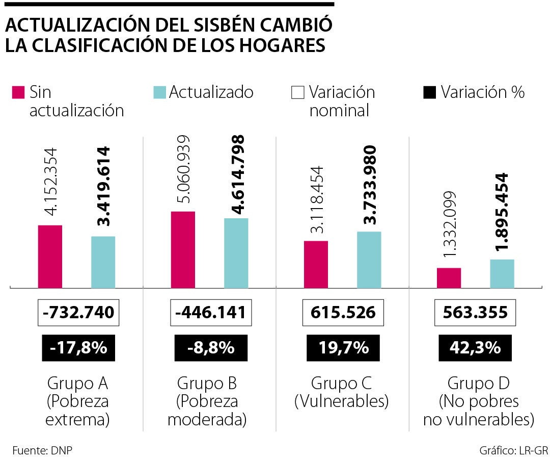 Un total de 1,17 millones de hogares serán recategorizados en el Sisben usando la información del Registro Social de Hogares, RSH. El Departamento Nacional de Planeaciòn, DNP, presentó la nueva metodología utilizada para actualizar la información económica que se utiliza en el país para el acceso a subsidios y programas sociales del Gobierno Nacional. La entidad determinó que 732.740 hogares clasificados en el Grupo A del Sisben, debían dejar de pertenecer a esta categoría.