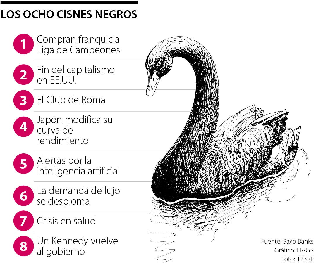 Se cree que 2024 será un año muy movido tanto en materia económica como política. Los más importantes bancos esperan una desaceleración de la economía y se estima un crecimiento del PIB mundial de 2,7%, lo que representa una ralentización de 0,5%. En el plano político, cerca de 70 países celebrarán elecciones. Todo este contexto es utilizado por los economistas de Saxo Bank, que ha presentado sus ya tradicionales cisnes negros, ahora llamados predicciones escandalosas, para el próximo año. Los vaticinios van desde el fin del capitalismo en EE.UU., hasta el petróleo rondando nuevamente los US$150 por barril, lo que llevaría a Arabia Saudí a comprar la Champions League. Incluso, sobre las elecciones en la Unión Americana, Saxo Bank señala un cisne negro: la elección de Robert F. Kennedy.