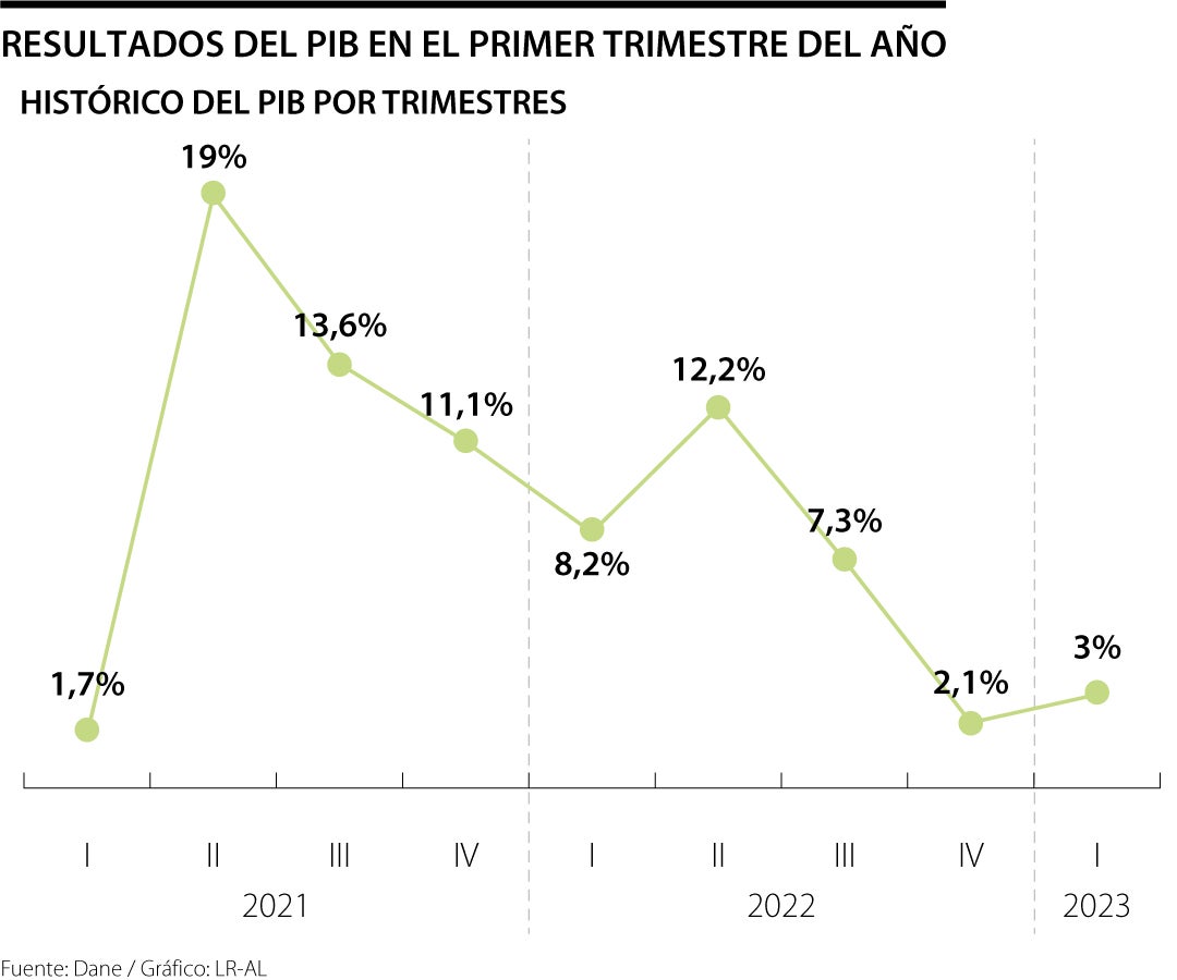 El sector financiero, especialmente por los seguros; y el de entretenimiento, con los conciertos, carnavales y juegos en línea, siguen impulsando la economía colombiana, que creció 3% en el primer trimestre del año. La variación estuvo por debajo de proyecciones como las de Corficolombiana (3,8%), Bancolombia (3,4%) e Itaú (3,3%). Además, fue menor que el dato del mismo trimestre del año pasado (8,2%), lo que, según expertos, ya evidencia una desaceleración. Según el Dane, las actividades financieras y de seguros fueron las de mayor aporte en el primer cuarto del año.
