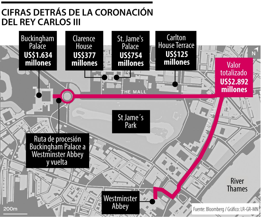 Carlos III del Reino Unido tenía una fortuna personal que superaba los US$800 millones, pero los activos de la Corona británica superaban los US$21.000 millones. Dentro de estos se encuentran las propiedades de la monarquía y sus valores netos, que juntos aumentaron alrededor de 80% en promedio durante la última década, según datos compilados por Bloomberg. Todo esto sumado al dinero que le fue transferido por herencia de la Isabel II.