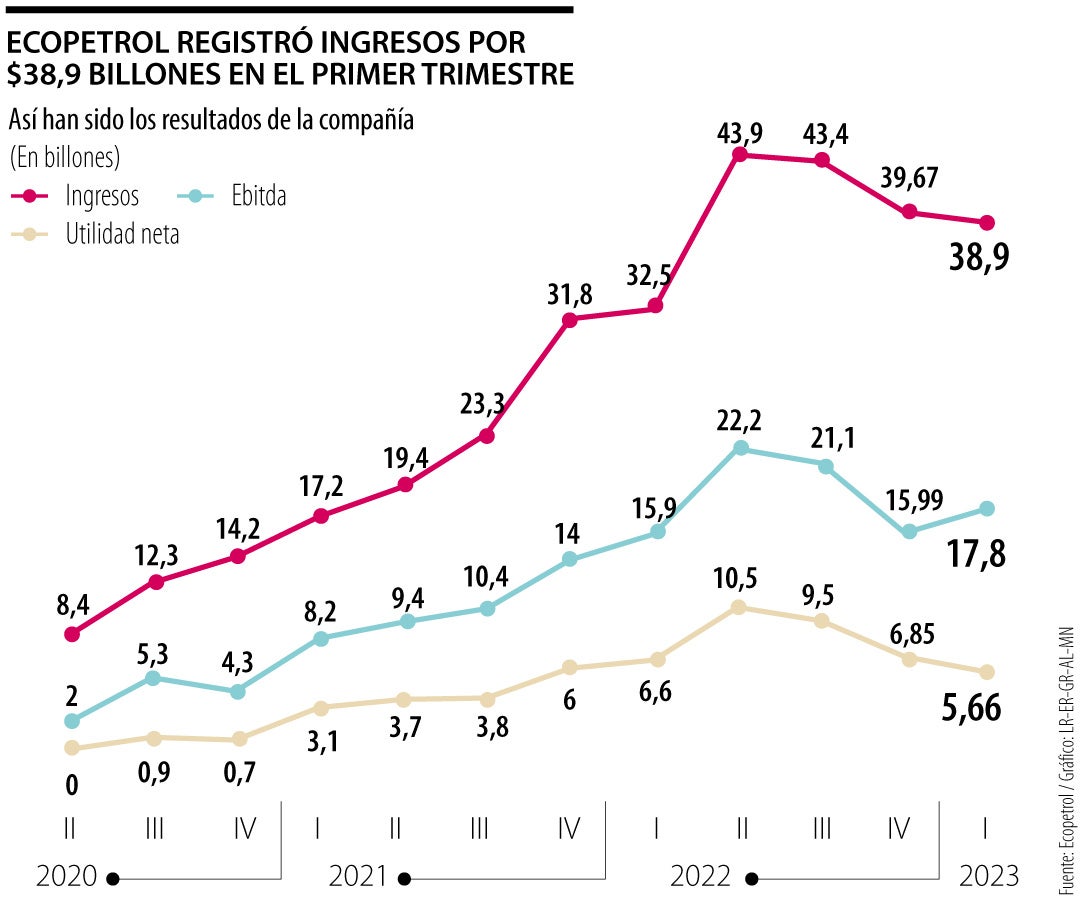 Ecopetrol entregó sus resultados operativos y financieros para el primer trimestre del año. Estos fueron los primeros compartidos desde que Ricardo Roa asumió como presidente de la compañía, a mediados de abril. Para el periodo comprendido entre enero y marzo de este año, la compañía recibió cerca de $38,9 billones en ingresos, una cifra 1,97% inferior a la que presentó en el último trimestre de 2022 (octubre-diciembre), pero 16,46% mayor a la del mismo periodo de 2022.