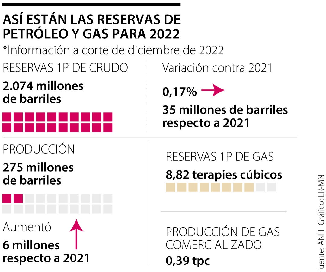El Ministerio de Minas y Energía y la Agencia Nacional de Hidrocarburos dieron a conocer el informe anual de reservas de petróleo y gas. El reporte, con corte al 31 de diciembre de 2022, estima que el país tiene reservas probadas de petróleo y gas para 7,5 y 7,2 años, respectivamente. Las reservas probadas de petróleo pasaron de 2.039 millones de barriles reportados en 2021 a 2.074 millones en 2022. Además, la producción de petróleo fue de 275 millones de barriles, un aumento de seis millones respecto al año anterior. Con corte a 2021, las reservas eran de 7,6 años.
