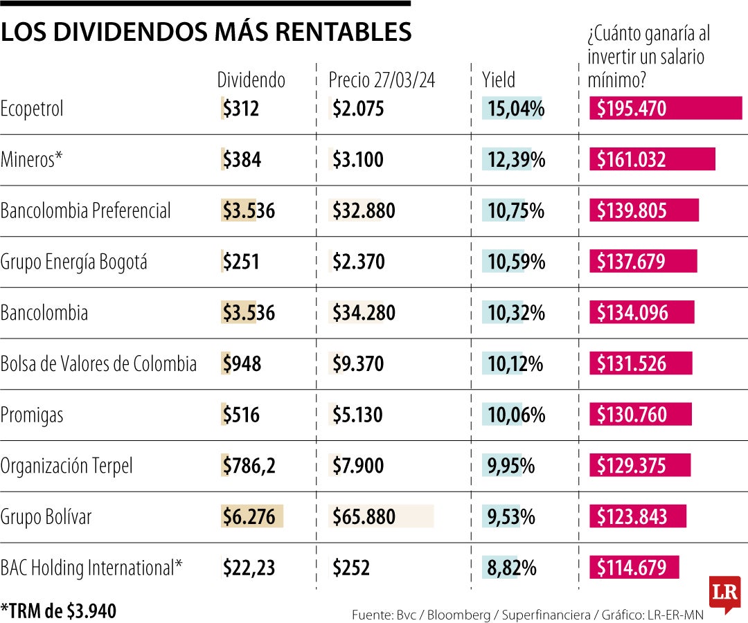 Los dividendos representan la porción de las ganancias que una empresa elige distribuir entre sus accionistas anualmente, ya sea proveniente de utilidades del año anterior de fondos específicamente asignados para este propósito. Con esto claro, donde usted podría rentabilizar más una inversión de $1,3 millones es en Ecopetrol, que pagará un dividendo de $312 por acción a sus accionistas, con una decisión que beneficiará al Gobierno, su principal socio. Luego de la petrolera, le siguen los títulos de Mineros, que a una tasa de cambio de $3.940, ofrece un yield de 12,39%, lo que representaría obtener $161.032,26 de llegar a invertir $1,3 millones. La compañía anunció que sus ingresos aumentaron en $165.557 millones (9%), al pasar de $1,7 billones a $1,9 billones entre 2022 y 2023. (CR)