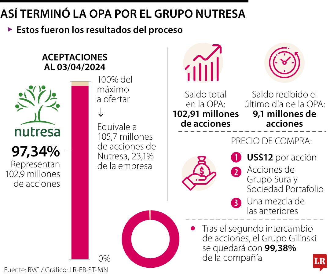 La Oferta Pública de Adquisición, OPA, que se lanzó por el Grupo Nutresa permitió que el Grupo Gilinski se quedara con cerca de 100% de la participación accionaria de la multilatina de alimentos. Y es que según lo comunicado por la Bolsa de Valores de Colombia, al final se consiguieron más de 102,9 millones de acciones (22,48% del total accionario) sobre los 105,7 millones de títulos que se buscaban en el proceso. Esto representaría que Gilinski acumularía 99,38% sobre el total de la compañía. (CG)