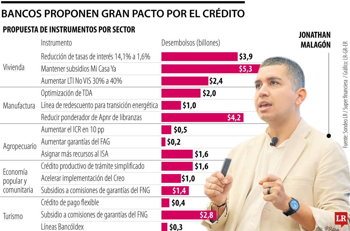 Esta estrategia, según Malagón, propone aumentar los desembolsos destinados a los sectores de vivienda, manufactura, agro, turismo y economía popular en $35 billones. “Esto llevará los desembolsos anuales, que actualmente bordean los $120 billones, a $155 billones, representando un aumento de 30% en la colocación anual”, añadió el líder del gremio. Dicho aumento, según conoció LR, se daría en los próximos 12 meses y se distribuiría en algunos de los sectores económicos del país.