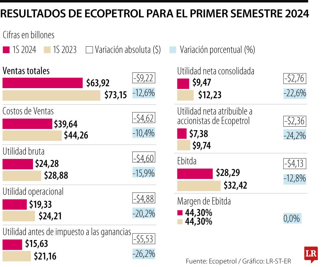 Las utilidades de Ecopetrol siguen sin levantar cabeza. La compañía entregó sus resultados operativos y financieros para el segundo trimestre y del primer semestre. La petroleraya completó tres trimestres consecutivos con caídas en sus ganancias. Registró una caída en sus utilidades en lo corrido de 2024, con corte a junio. Las ganancias de la petrolera en el primer semestre fueron de $7,38 billones, una reducción de 24,2% frente a los $9,74 billones de los primeros seis meses del año pasado. (BB)