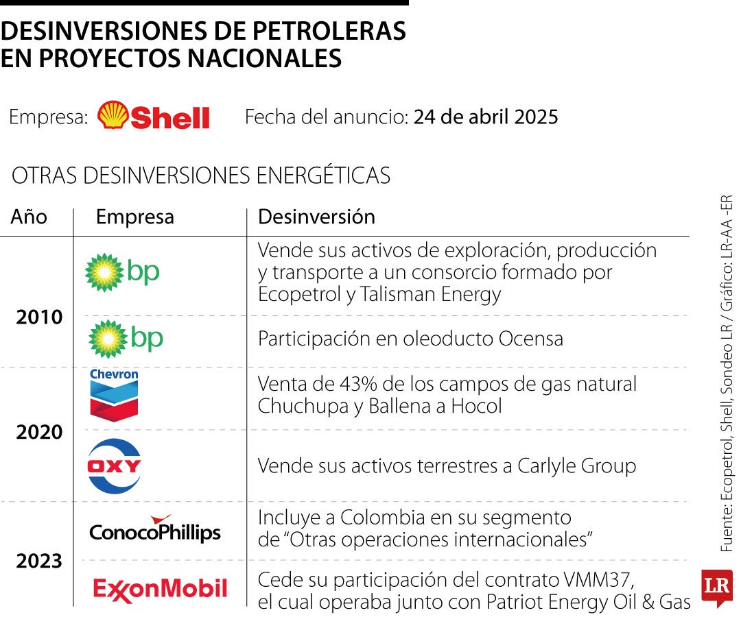 Con la salida de Shell, son seis petroleras las que desinvierten en el mercado gasífero en Colombia, pues previamente lo hicieron BP, ConocoPhillips, OXY, Chevron y Exxon.
