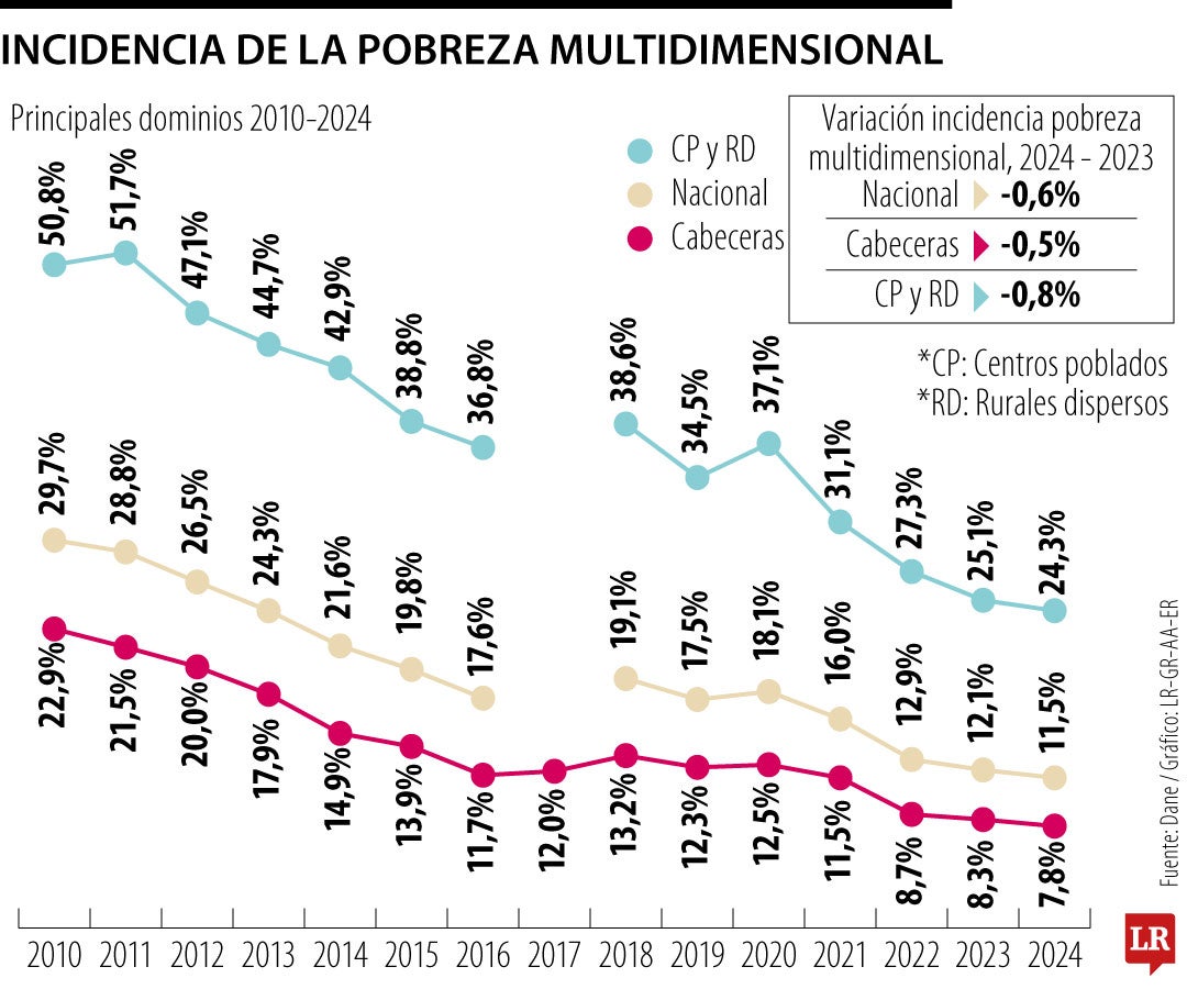 En las cabeceras municipales, la pobreza multidimensional se ubicó en 7,8%, mientras que en los centros poblados y rurales dispersos fue de 24,3%. En las cabeceras, el descenso fue de 0,5 puntos; y en las zonas rurales, de 0,8 puntos. Según el Dane, del total de personas en condición de pobreza multidimensional en el país, 3,1 millones viven en cabeceras municipales y 2,8 millones en áreas rurales.