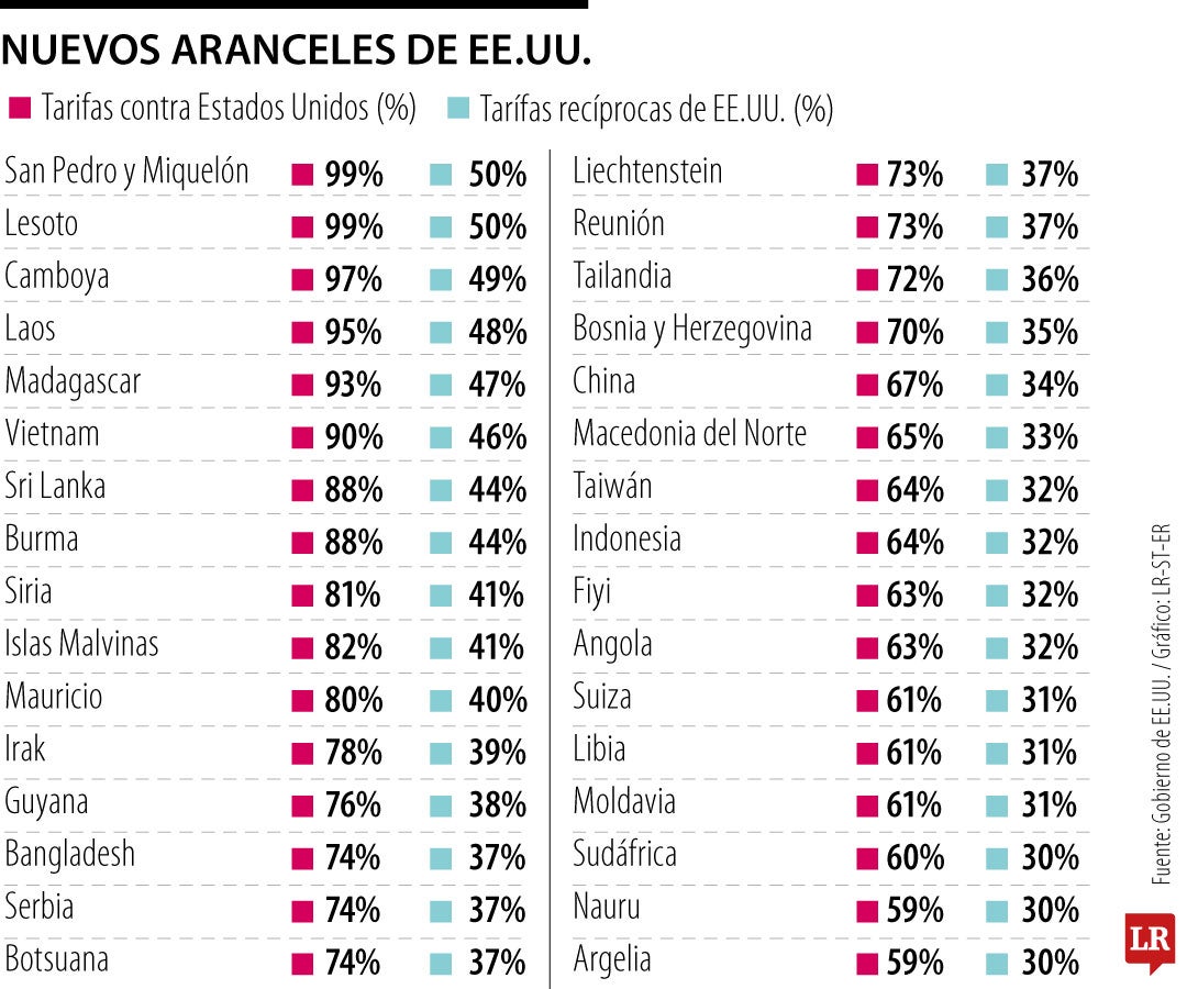 Entras las zonas que tienen una tasa arancelaria más alta, están San Pedro y Miquelón, Lesoto, Argelia, Camboya, Laos y Madagascar, con 50%, 50%, 59% 49%, 48% y 47% respectivamente. Mientras que en los más bajos estuvo Islas Heard y McDonald, Svalbard y Jan Mayen y Guinea-Bisáu, con 10% cada uno. Reuters asegura que los amplios aranceles serán nuevas barreras sobre la mayor economía del mundo.