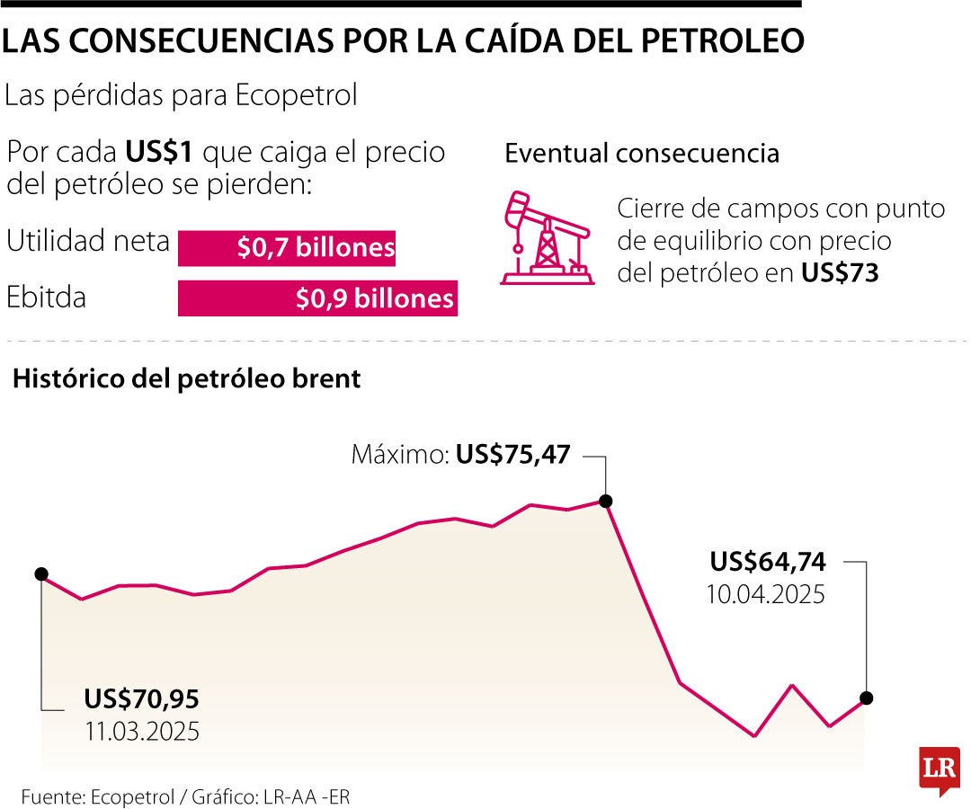 Roa señaló que la utilidad neta podría caer $0,7 billones y el Ebitda $0,9 billones por cada dólar que disminuya el precio del Brent. Con este panorama, las utilidades de la compañía podrían reducirse hasta $12 billones. “Si asumimos un precio de US$73 por barril, y ahora está en US$63, vendemos 12 millones de barriles de crudo al mes”, explicó Roa.