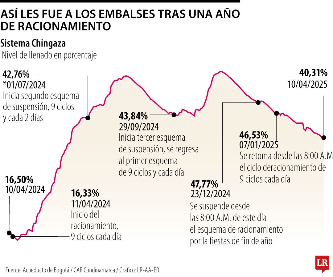 Hace un año inició el racionamiento de agua para mitigar los problemas de sequía, intensificada por el fenómeno de El Niño en 2024 y seguir abasteciendo a Bogotá. En abril del año pasado, el Sistema Chingaza, que es el principal embalse que abastece a la ciudad, se encontraba en niveles alarmantemente bajos, alcanzando 16,5% de su capacidad de almacenamiento.