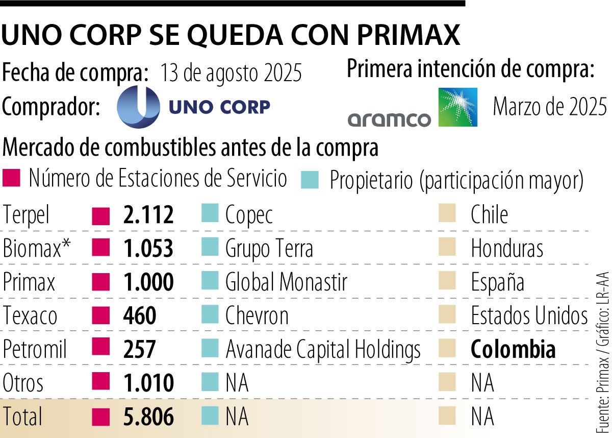 De esta manera, la intención de compra que la petrolera saudí Aramco, que había anunciado a inicios del año, por Primax Colombia quedaría frustrada, ya que lo único que falta para que UNO Corp sea el controlante es la aprobación de la Superintendencia de Industria y Comercio. UNO Corp es un grupo empresarial centroamericano fundado en Honduras que actualmente cuenta con más de 30 años de experiencia en distribución de combustibles, con operación en siete países de Latinoamérica, incluida Colombia.