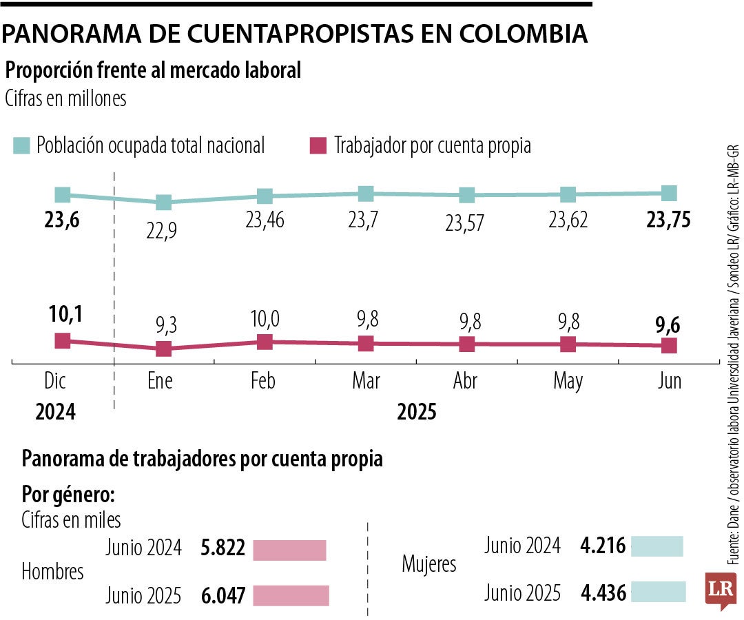 Los cuentapropistas representan una parte significativa del empleo en Colombia. Según reveló el Departamento Administrativo Nacional de Estadística, Dane, en junio se reportaron 9,6 millones de trabajadores por cuenta propia, lo que representa 40,8% del total de trabajadores que hay en todo el país. De acuerdo con el presidente de la Andi, Bruce Mac Master, la proporción de trabajadores sin aportes a la seguridad social es alta: cerca de seis de cada 10 colombianos trabajan en la informalidad.