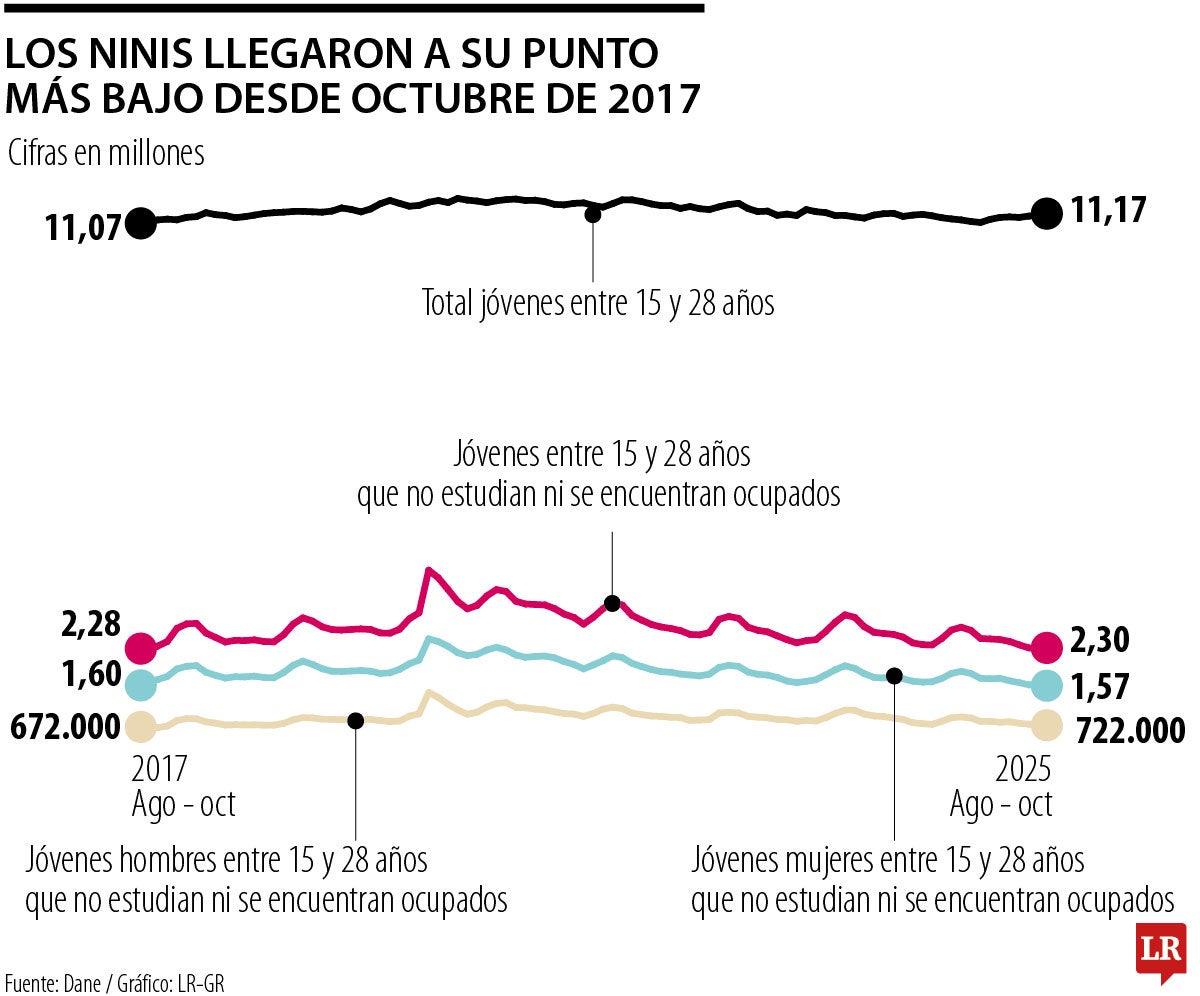 El Departamento Administrativo Nacional de Estadística dio a conocer las cifras del mercado laboral juvenil correspondientes a octubre. De los 11,1 millones de jóvenes entre 15 y 28 años, 2,3 millones no estudian ni trabajan, conocidos como ninis. La última vez que se registró un nivel similar fue en octubre de 2017, cuando el número de ninis se ubicó en 2,28 millones.