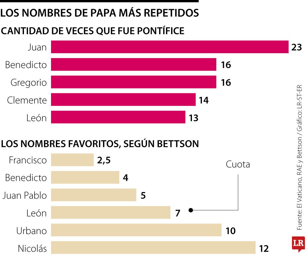 Según la plataforma Bettson, Francisco es el más opcionado, con una cuota de 2,5. En segundo lugar estaría Benedicto, uno de los tres nombres más repetidos en la historia del papado, que da cuatro veces lo jugado y, para cerrar los más opcionados, está Juan Pablo, que paga $5 por cada $1 apostado. Mientras tanto, el nombre León representa la fortaleza que requiere la Iglesia Católica para sostener su rol moral y evangelizador. (MPL)