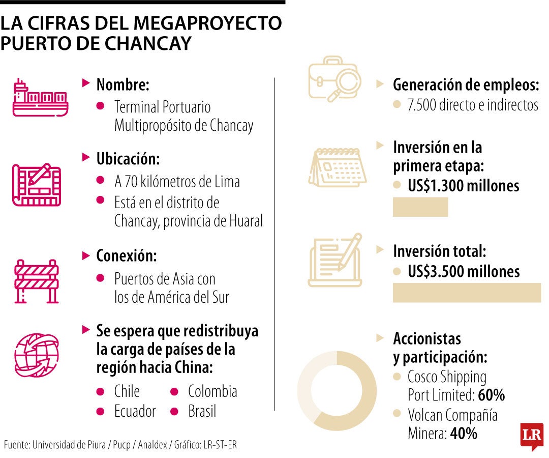 El megapuerto de Chancay está ubicado a 70 kilómetros de Lima, Perú, en la bahía de Chancay, provincia de Huaral. Promete ser el proyecto más importante de transporte marítimo para conectar los puertos de Asia con los de América del Sur, con lo cual beneficiará a países de la región, como es el caso de Colombia y Brasil, al recortar en 10 días el trayecto.