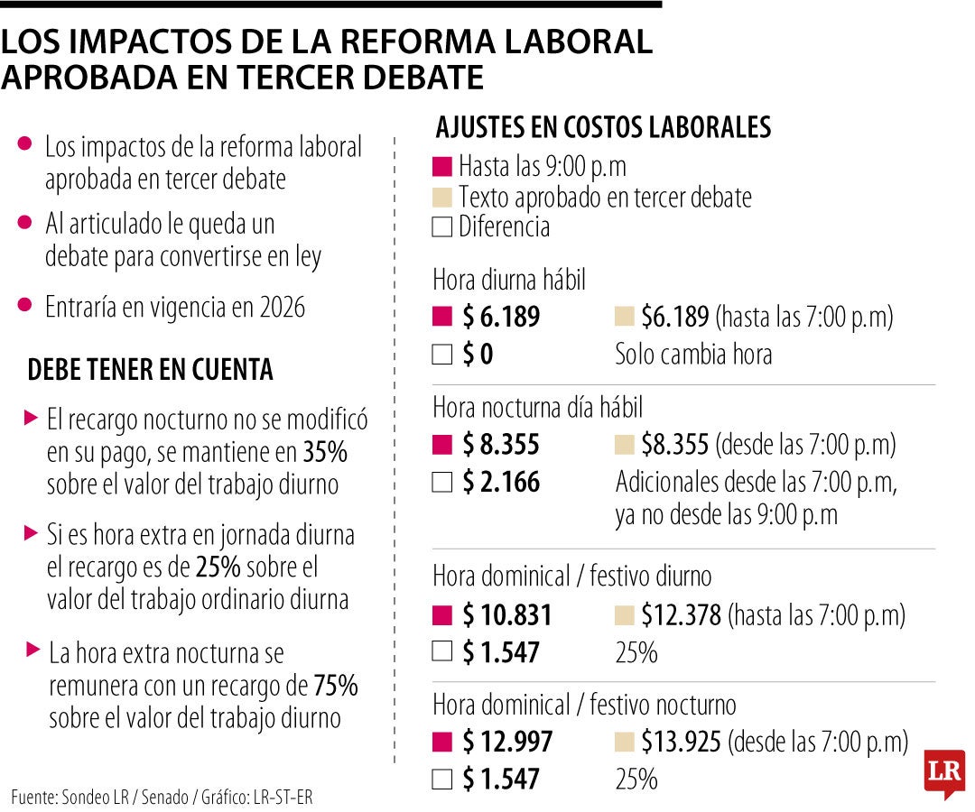 Los colombianos enfrentarán un nuevo régimen laboral a partir del 1° de enero de 2026 si se aprueba la reforma laboral, que está a punto de cursar su cuarto debate en la Plenaria del Senado, siendo este el último trámite para que se convierta en ley de la República. En ese nuevo sistema se plantean cambios en las dinámicas con las que tradicionalmente se ha trabajado en el país, pues no solo se reestructurará el valor de las horas extras, los dominicales y festivos, sino que también se reducirá la jornada laboral, que para julio de 2025 ya debería estar en 44 horas.