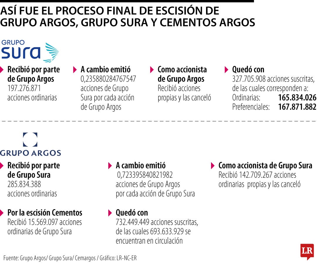 Ahora, cada compañía operará de manera independiente y enfocada en su negocio. Como resultado de las escisiones, se realizaron tres transferencias clave de acciones: Grupo Argos recibió 15.569.097 acciones ordinarias de Grupo Sura tras la escisión de Cementos Argos; luego, Grupo Argos transfirió a Grupo Sura un bloque patrimonial con 197.276.871 acciones de Sura, mientras que Grupo Sura hizo lo propio a favor de Grupo Argos con 285.834.388 acciones de Grupo Argos.