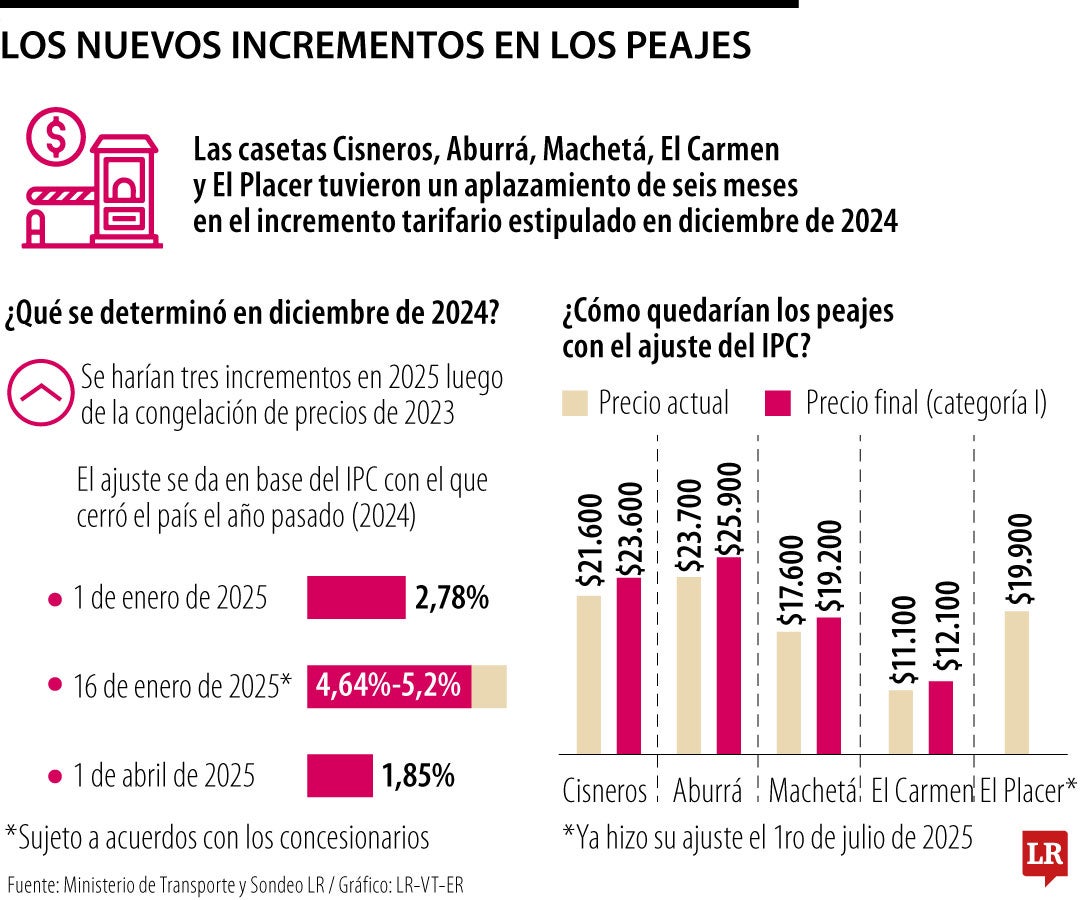 Una vez concluida la temporada vacacional de mitad de año, los cinco peajes que aún no habían aplicado el ajuste tarifario correspondiente a 2025 lo harán en los próximos días. El viernes 11 de julio entrarán en vigencia los nuevos valores en las casetas de Cisneros, en Antioquia, y Machetá, en Cundinamarca. El 1º de julio, el peaje de El Placer, en Nariño, ya realizó su respectivo incremento. De acuerdo con lo establecido por el Ministerio de Transporte, desde el 10 de enero los peajes vienen aplicando alzas graduales. (JC)