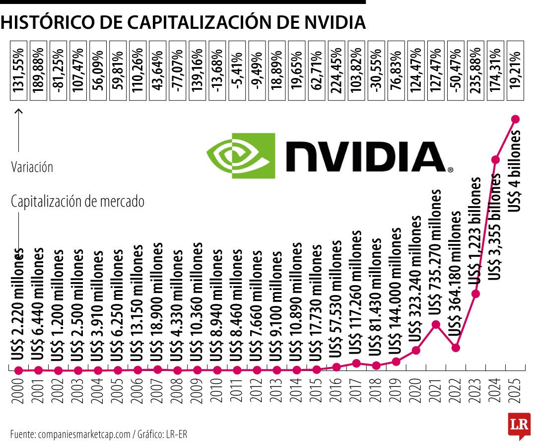 Nvidia alcanzó el miércoles 4 de julio por primera vez una capitalización bursátil de US$4 billones, consolidando su posición como uno de los valores más favorecidos de Wall Street para aprovechar el actual aumento de la demanda de tecnologías de inteligencia artificial, IA. Las acciones del principal diseñador de chips de IA de gama alta avanzaban 2,4% en la sesión, a US$164, convirtiéndose en la primera empresa con cotización pública del mundo que alcanza este hito. Los chips de Nvidia han logrado avances en el entrenamiento de los mayores modelos de IA, lo que impulsando la demanda de productos. Una carrera entre Microsoft, Amazon, Meta Platforms, Alphabet y Tesla para construir centros de datos de IA y dominar la tecnología emergente ha alimentado una demanda de los procesadores de gama alta de Nvidia. (RT)