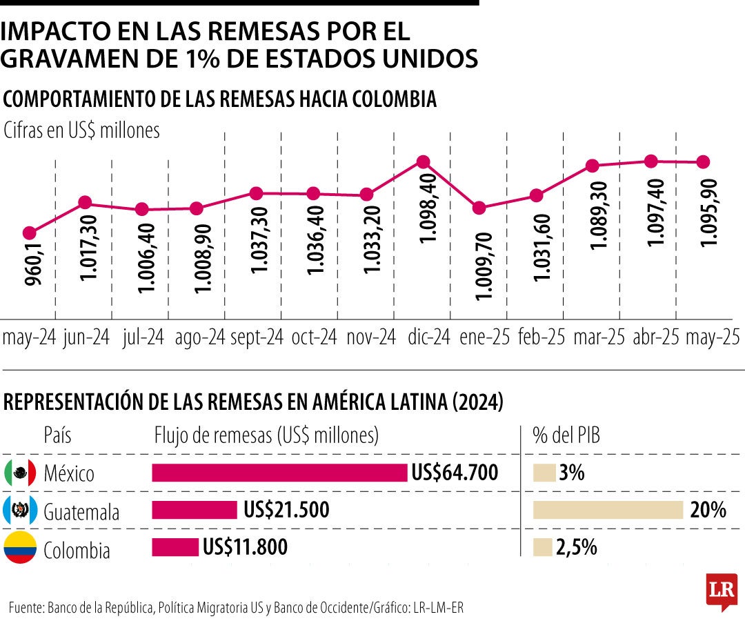 La política proteccionista que adoptó Donald Trump en su segundo mandato como presidente de Estados Unidos trajo consigo un impuesto para todas las remesas que salgan desde este territorio. El impuesto de 1% a las remesas salientes de Estados Unidos, enmarcadas en la Obbb (Un Gran y Hermoso Proyecto de Ley en su traducción a español), tendría un impacto sobre el flujo entrante de divisas a Colombia por este concepto. Se dejarían de recibir cerca de US$60 millones a la economía solamente en 202. (JC)