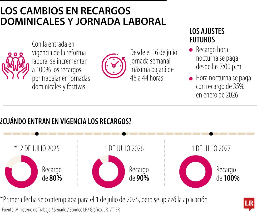 El ministro de Trabajo, Antonio Sanguino, dijo que desde hoy, domingo 13 de julio, los recargos por dominicales y festivos harán el primer incremento, pasando de 75% a 80%, tal como lo contemplaba la Reforma Laboral. Este fue uno de los puntos que comenzó a regir con la promulgación de la ley, pues se acordó que su entrada en vigencia fuera progresiva. El ajuste entra en rigor casi a la par de la reducción de la jornada, de 46 a 44 horas semanales. El próximo se hará el 1° de julio de 2026 y subirá a 90%. (MM)