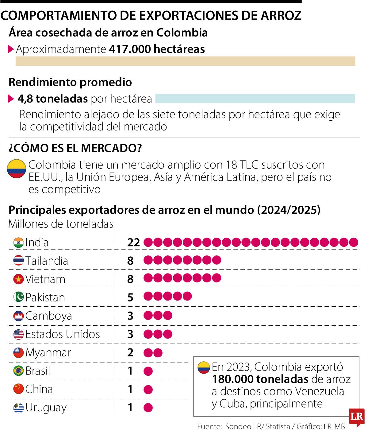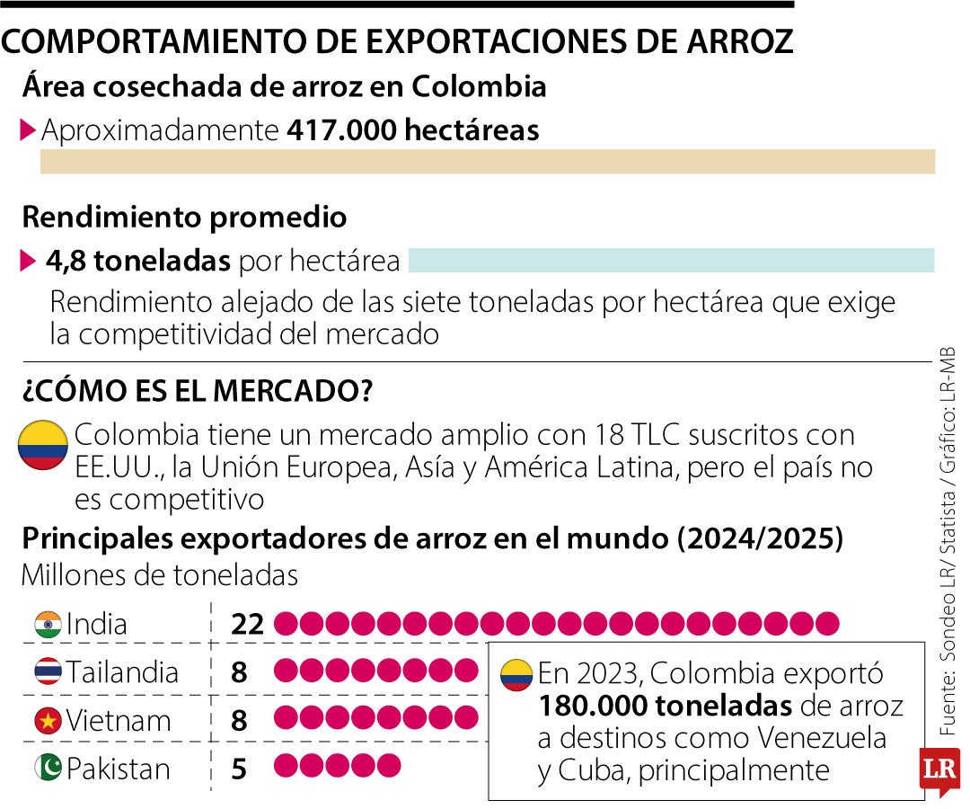 En 2023, Colombia exportó 180.000 toneladas de arroz, principalmente a países como Venezuela y Cuba. India lidera en exportaciones