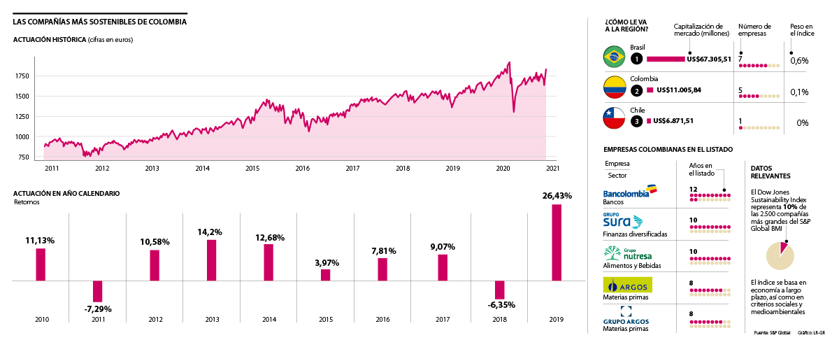 Las otras empresas colombianas incluidas en el ranking de Dow Jones son Grupo Sura y Grupo Nutresa, que llevan 10 años consecutivos cada una dentro del listado.