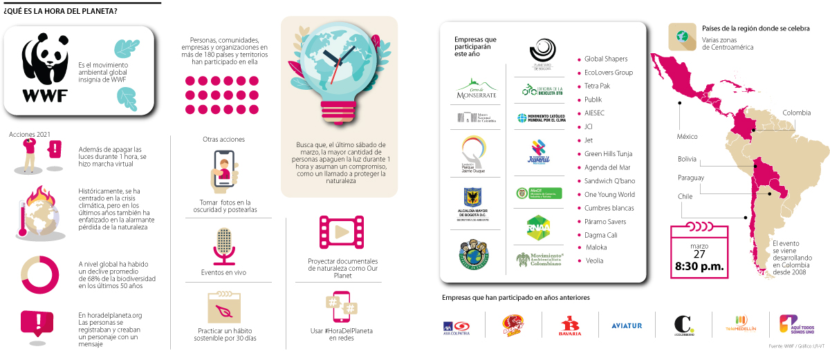 ‘La Hora del Planeta’ se ha celebrado en Colombia desde 2008 con el propósito de inspirar iniciativas de protección a la naturaleza y el medio ambiente en el país, así como impulsar la concienciación, acciones y cambios en las diferentes políticas públicas y privadas referentes al cambio climático. Para lograrlo, el evento organizado por World Wildlife Fund (WWF) ha contado con múltiples aliados en el sector empresarial desde sus inicios y que, para esta edición, llegan a 30 en total (ver gráfico).