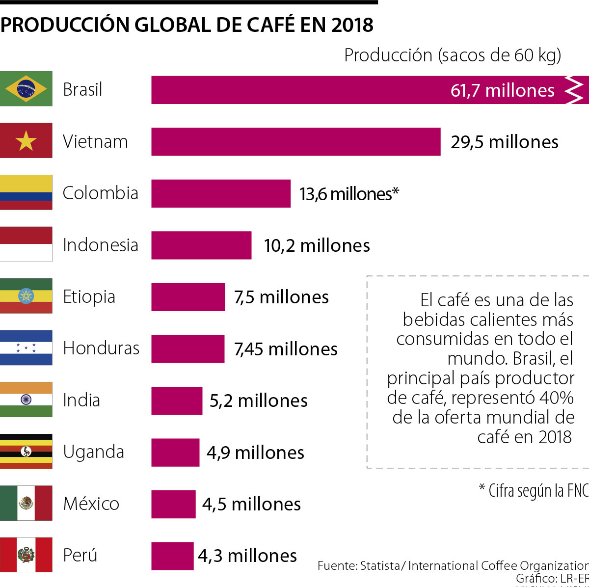 De acuerdo con cifras de la Organización Internacional de café (ICO, por sus siglas en inglés) el año pasado la producción total de los países exportadores de este grano fue de 168,09 millones de sacos de 60 kilogramos. En el top 10 de los países con mayor producción, según las cifras que unificó Statista, basado en información de ICO el liderazgo fue para Brasil con 61,7 millones de sacos con un alza de 17%.