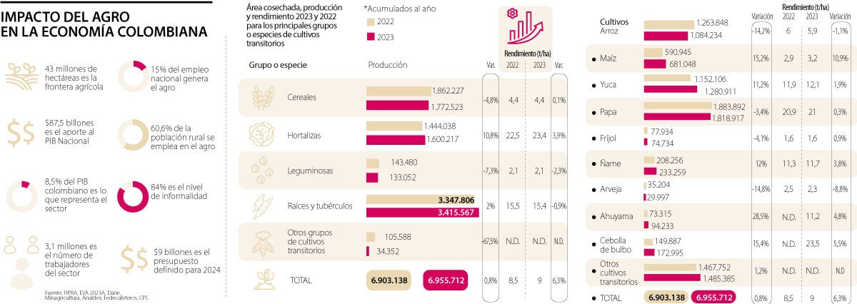 2023 no ha sido fácil para el agro colombiano. Aunque algunos sectores han mostrado crecimientos en productividad y exportaciones, en conjunto, ha sido un año marcado por los altos costos de los insumos, la caída de precios internacionales, la inflación y las amenazas de la inseguridad.